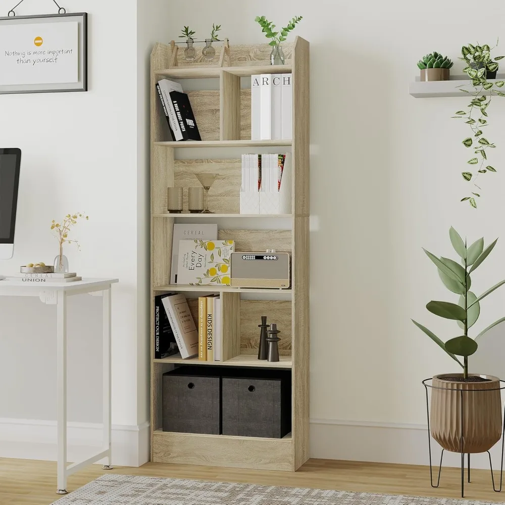 Librería de 6 Niveles, 24 x 60 x 170 cm, Estanteria Libros, Libreria Blanca para Exposición para Oficina, Salón, Roble Beige