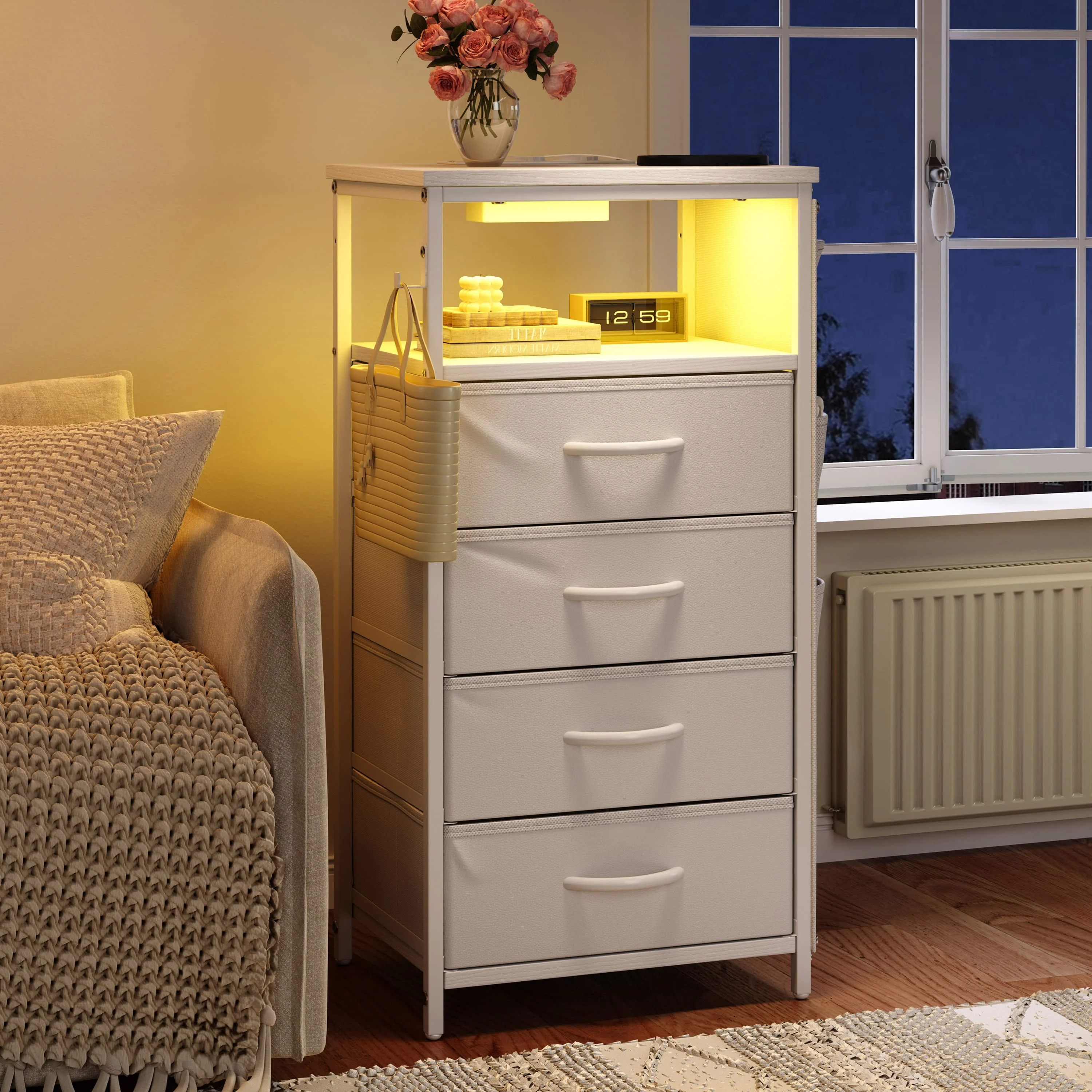 Mesita de noche MGMYM con LED RGB y estación de carga, mesa de noche 4 cajones, USB y enchufes, Almacenamiento Sala compacta-blanco/negro