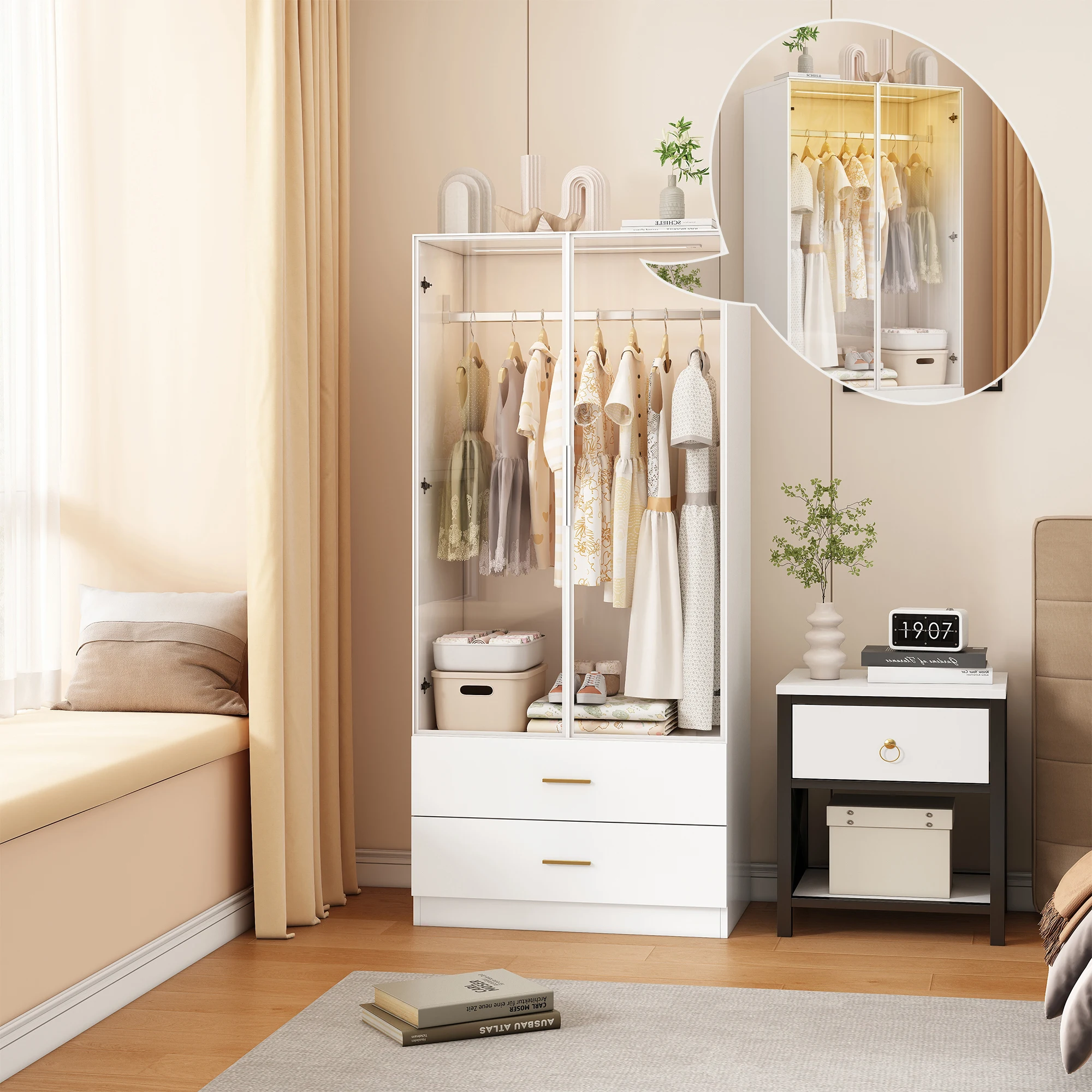Armario moderno blanco con luz LED y puertas de cristal, armario con estante y 2 cajones, (80x50x175 cm, MDF)