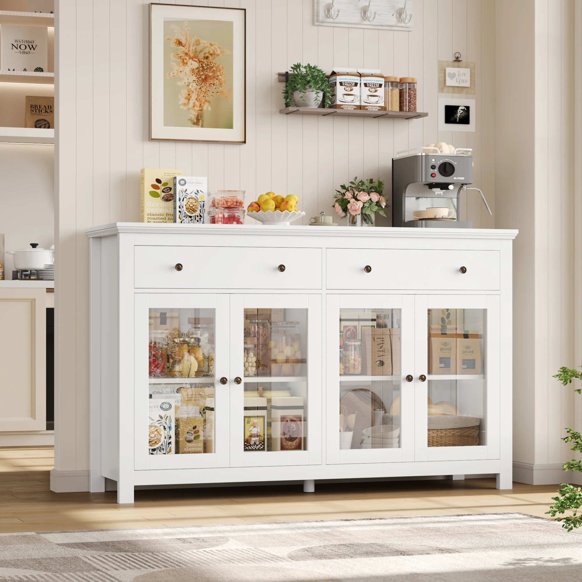 Getone Aparador Cocina 140cm Aparador de Cocina Grande Armario Blanco Muebles de Salón, con 2 Cajones y 4 Puertas de Cristal Armario de Cocina Estantes Ajustables 140x90,7x40cm