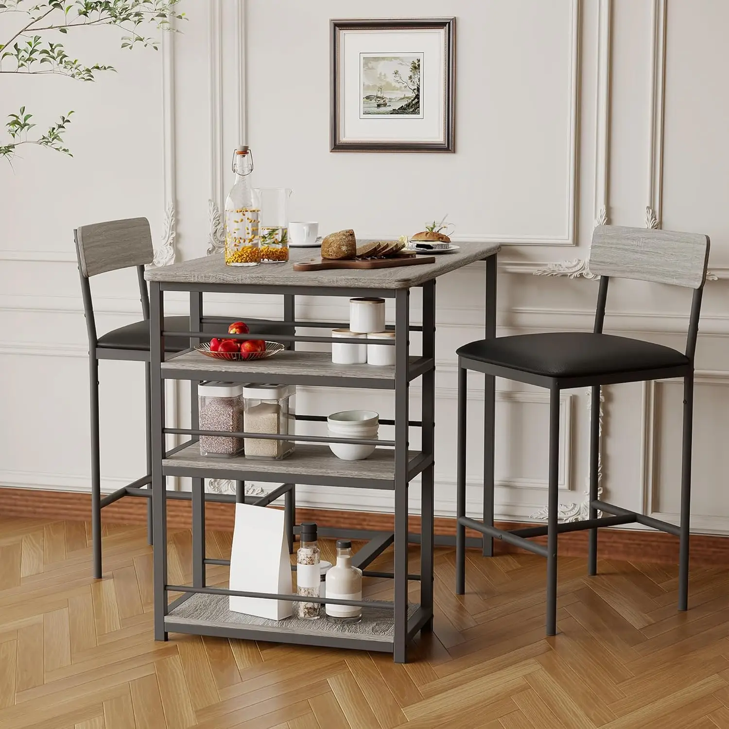 Juego de mesa y sillas para comedor, mesa de Bar para desayuno, cocina casera, con 2 sillas tapizadas y estantes de almacenamiento de 3 niveles, 3 uds.
