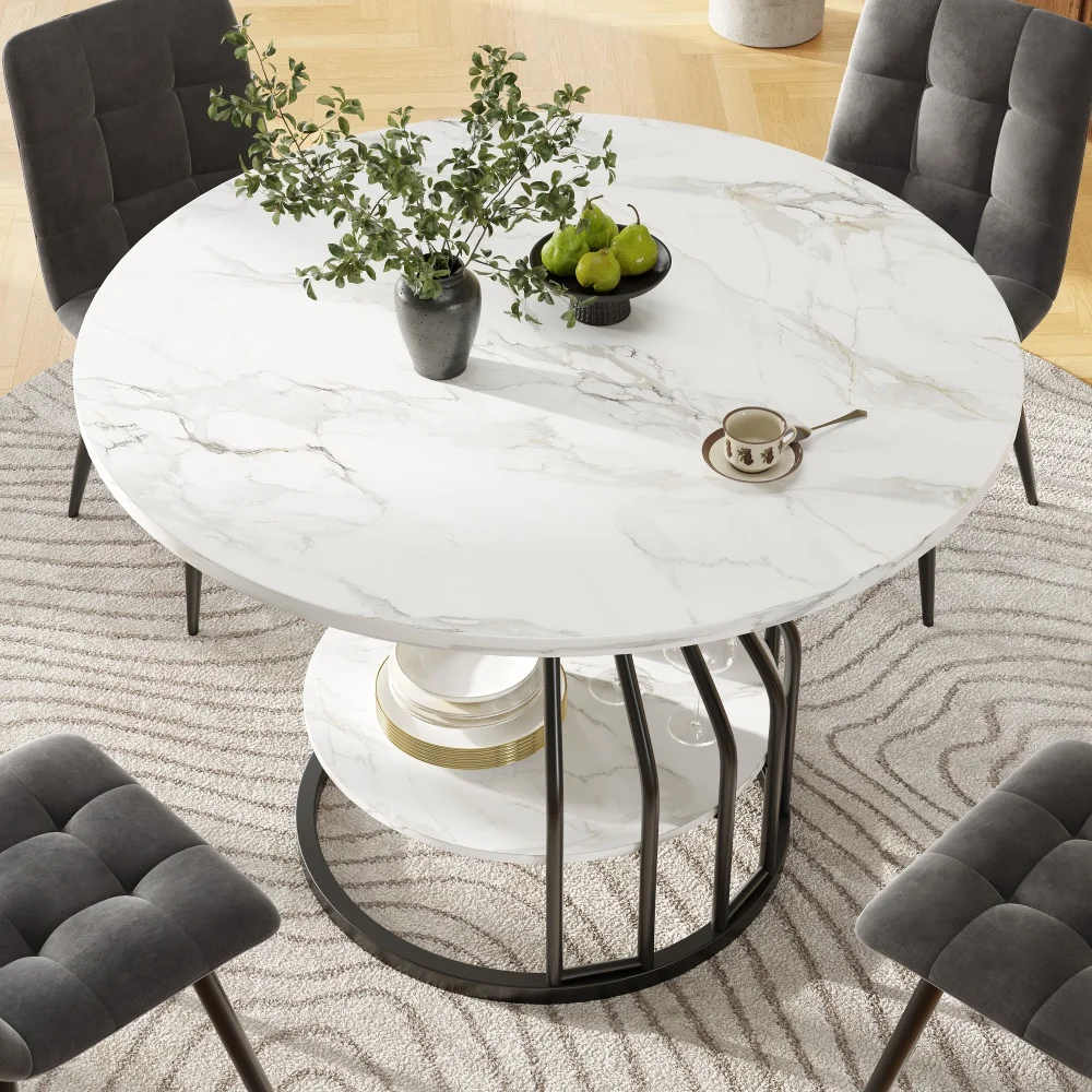 Mesa de comedor con plato redondo pequeño, adecuada para 4 personas, superficie de mesa con aspecto de mármol, mesa redonda,