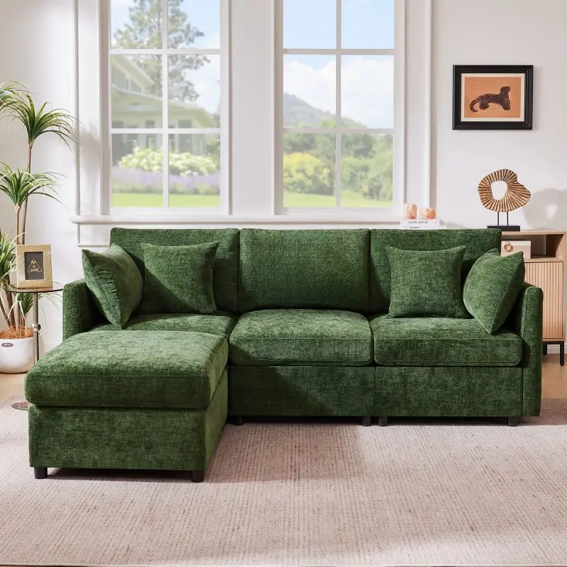 Sofá esquinero modular moderno en forma de L, color verde, con reposapiés móvil y 4 almohadillas de terciopelo de algodón puro, diseño cómodo.