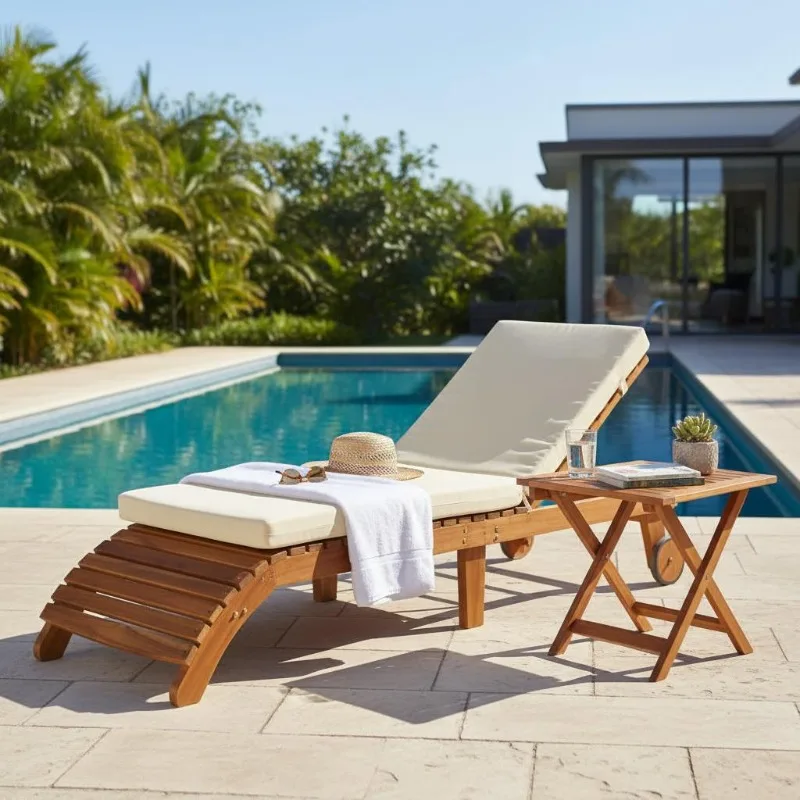 Chaise longue con mesa de madera maciza de acacia, color marrón