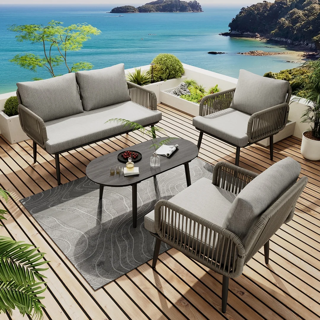 Sofá de exterior. Conjunto de sillones de jardín, conjunto de muebles de jardín, almohadas cómodas, sofá doble, dos sillones y mesa de centro