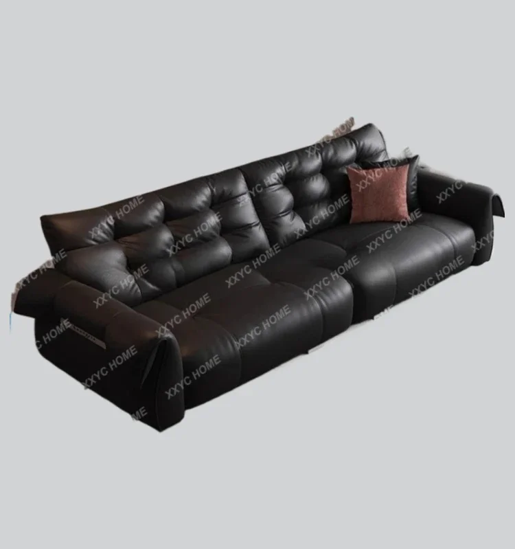 Sofá de cuero Z para sala de estar, simple, de primera capa de piel de vaca, negro, de fila recta.