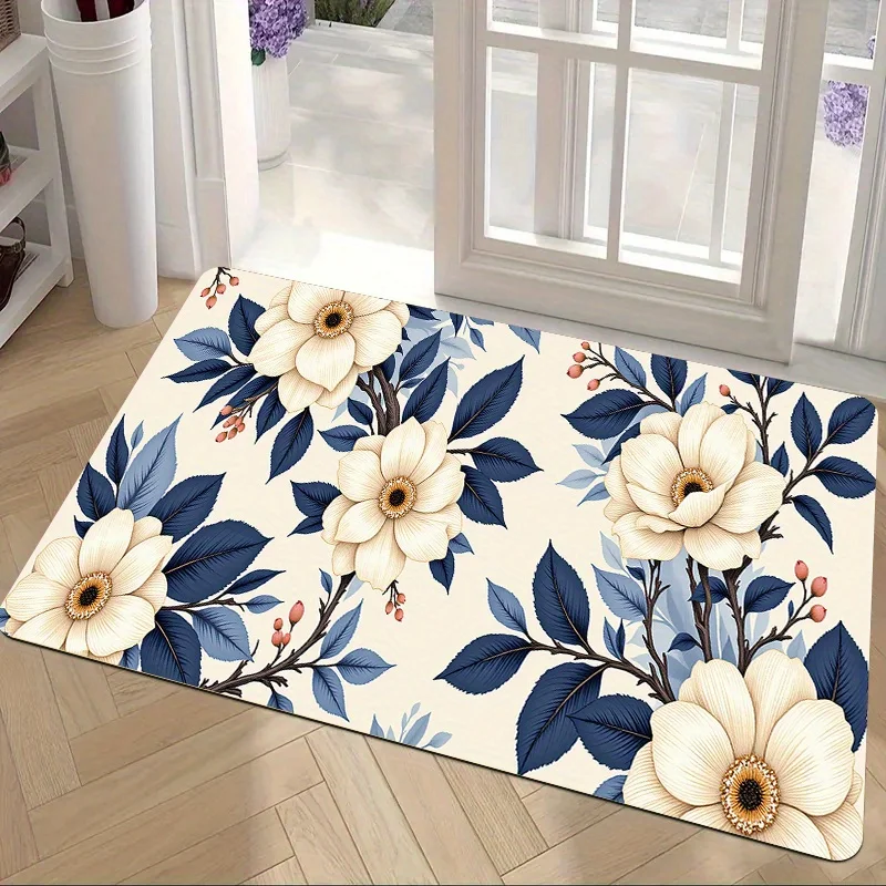 1 felpudo blanco con diseño de hojas azul marino, hecho de tela de poliéster, adecuado para entradas y salas de estar.