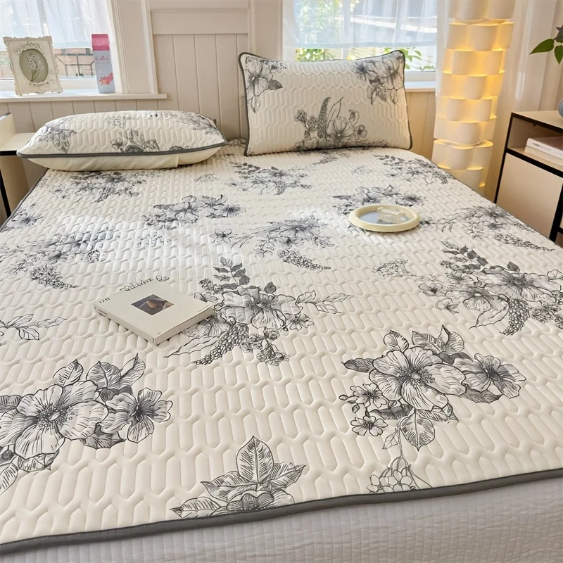 3 piezas de alfombrillas y fundas de almohada de látex transpirables suaves y frescas con estampado floral de bocetos (1 tapete + 2 fundas de almohada), lavado a máquina
