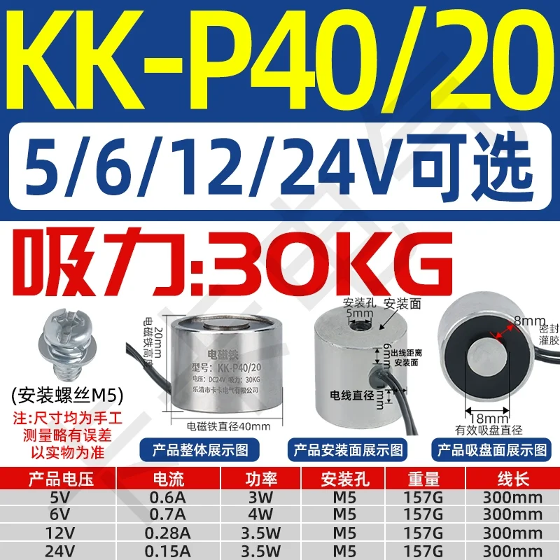 KK-P40/20 Solenoide redondo de 12V CC, ventosa magnética Industrial pequeña y potente para aplicaciones automotrices y de ingeniería