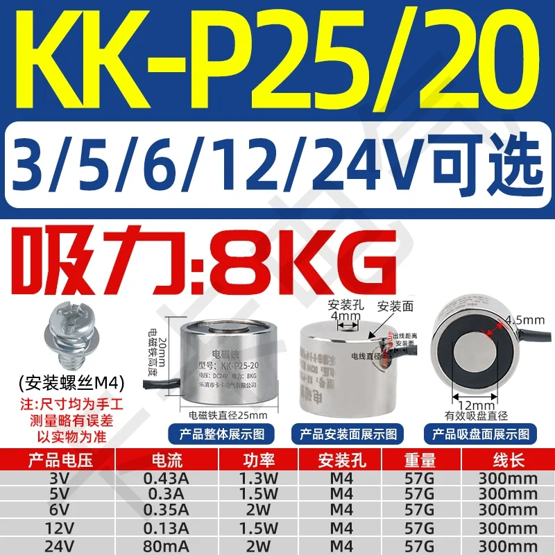 KK-P25/20 8KG 24V 12V 6V DC electroimán redondo pequeño potente imán de ventosa Industrial