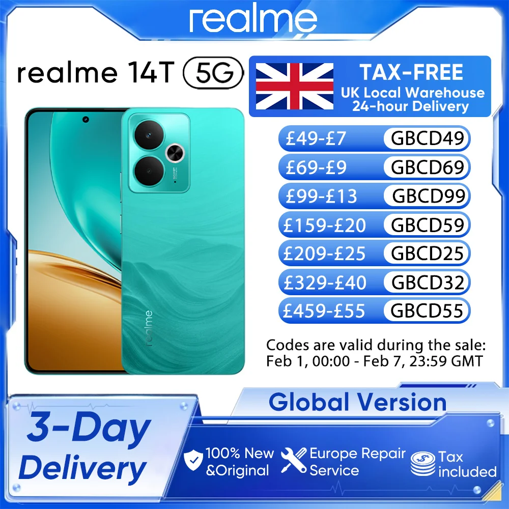 Realme 14T, versión Global, Mediatek Dimensity 6300 (6 nm), Pantalla AMOLED de 6,67 ", 120Hz, IP68, 45W, batería de 6000mAh, Android 15