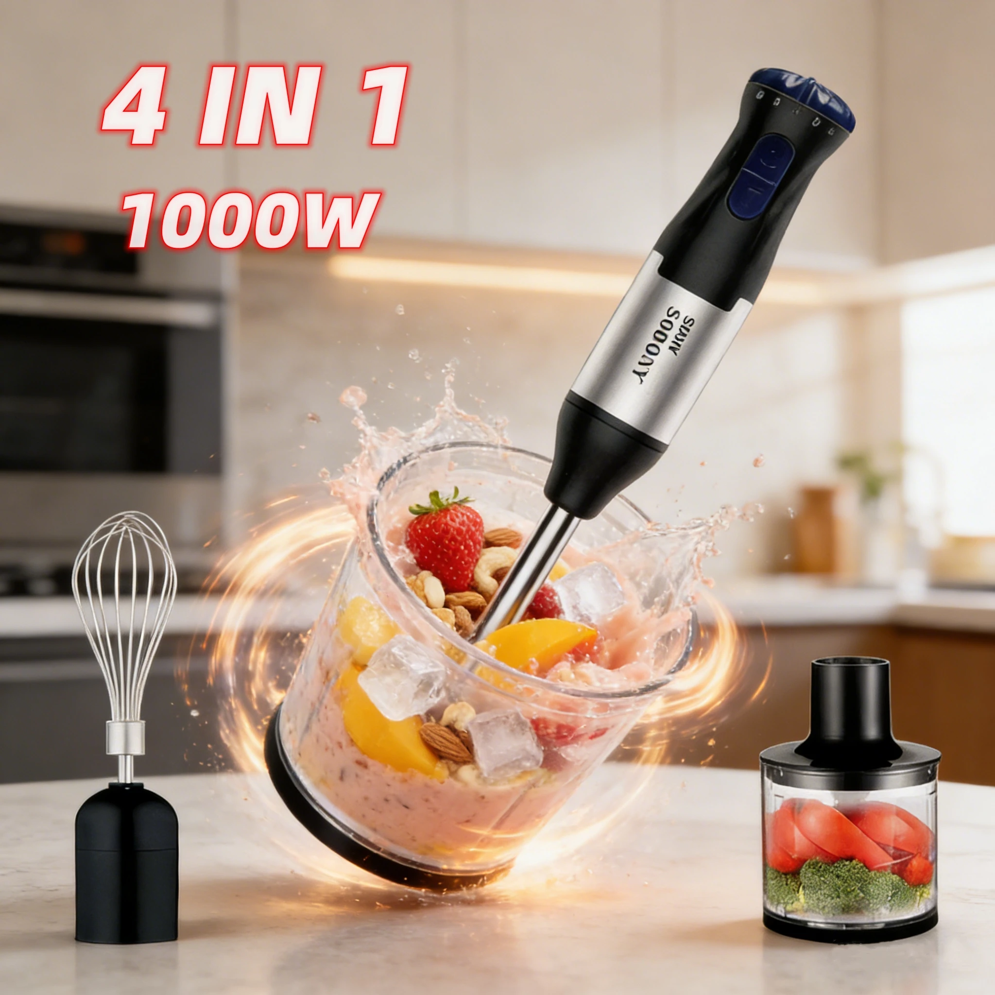 Batidora de mano eléctrica 4 en 1 de 1000W, licuadora de inmersión con hoja de acero inoxidable para juego de exprimidor de carne, verduras y huevos