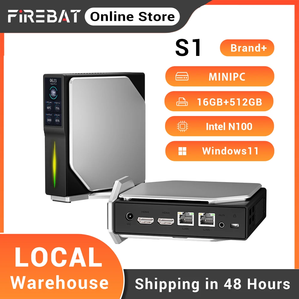 Mini PC FIREBAT S1 con Pantalla LCD, Intel N100, DDR4 16GB RAM, M.2 512GB SSD, WiFi 5, BT 4.2, LAN 1000M, Windows 11, Computadora de Escritorio