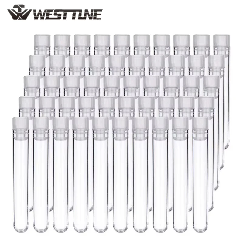 WESTTUNE 50 Uds tubos de ensayo de plástico 12x100mm tubos de plástico transparente de laboratorio con tapas para experimentos científicos plantas de almacenamiento de muestras