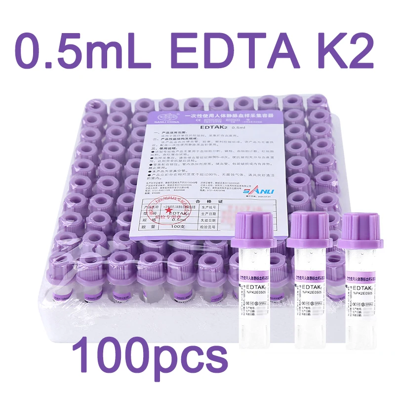Tubo de recolección de sangre Micro estéril, tubos EDTA K2 de 0,5 ml, tapa púrpura, tubos de ensayo de análisis desechables de plástico para laboratorio, 100 Uds.