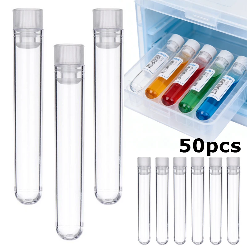 50 tubos de ensayo de plástico transparente con tapas blancas de rosca y a presión - Frascos contenedores de muestras para laboratorio, suministros científicos