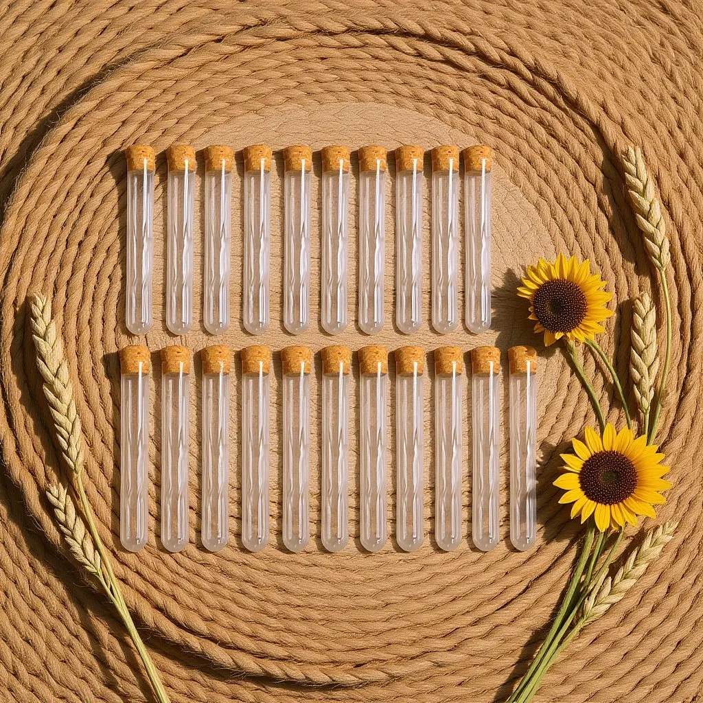 25 tubos de ensayo de plástico transparente sin marcar con tapones de corcho de madera auténtica, perfectos para laboratorios escolares, experimentos caseros y almacenamiento de reactivos