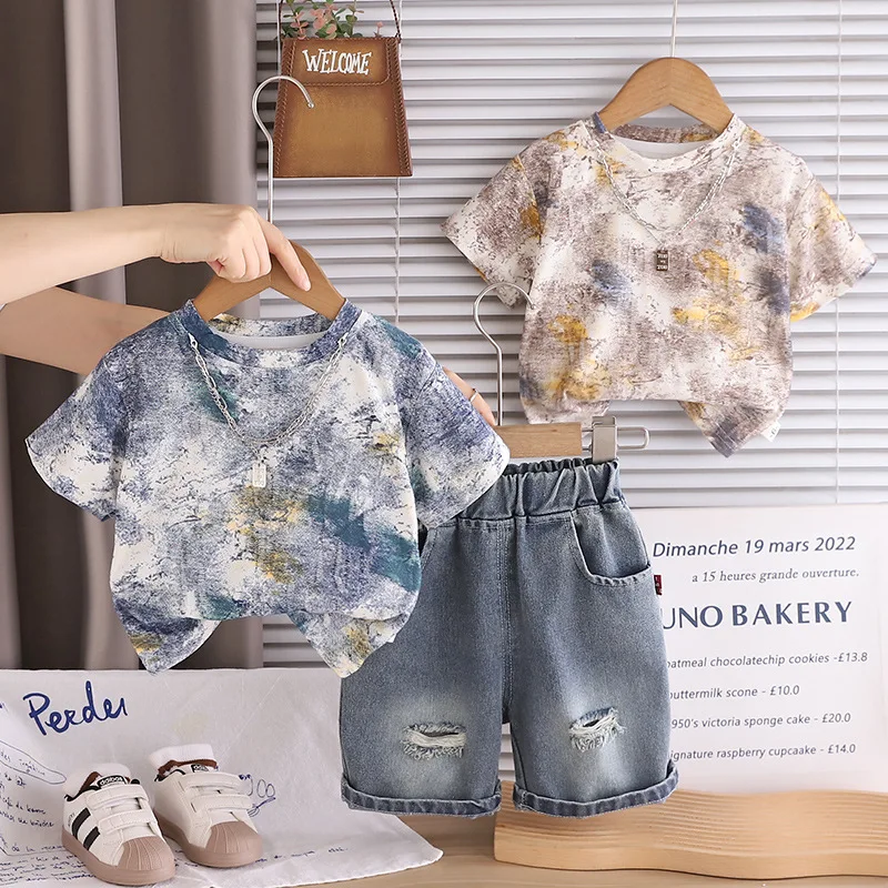 Novedad de verano, conjuntos transpirables para niños, camiseta y pantalones cortos Doodle a la moda para niños, traje de 2 piezas, trajes informales para niños de 1 a 5 años