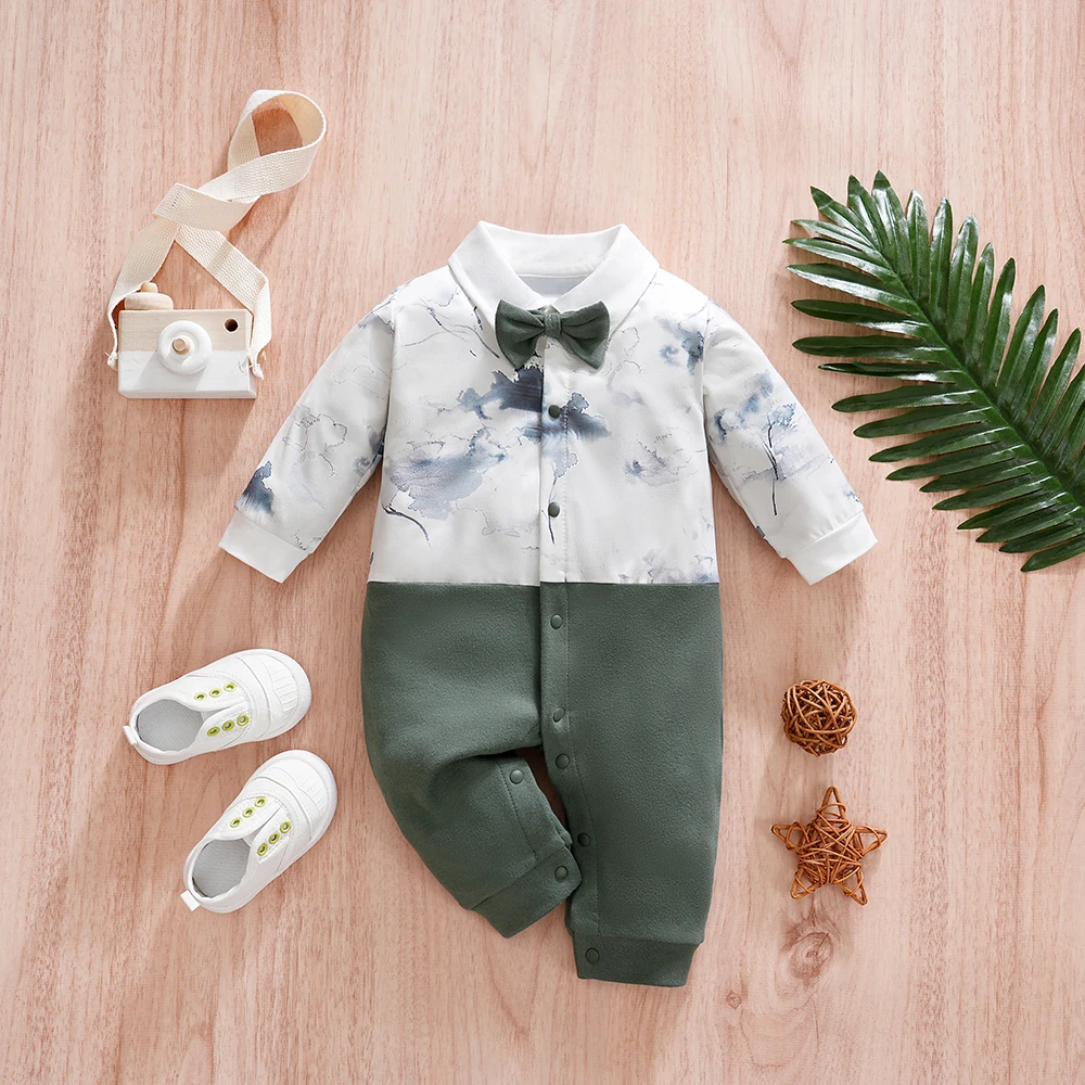 Pelele Formal para bebé recién nacido, conjunto de dos piezas falso de manga larga, diseño de pajarita de caballero, traje de bautizo, ropa infantil para niño
