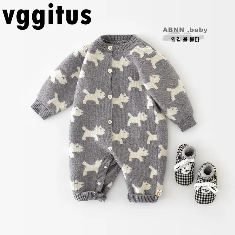 Otoño Invierno bebé niña niño mameluco de punto con patrón de perro de dibujos animados gris manga larga mono abotonado cálido mono infantil Y5033