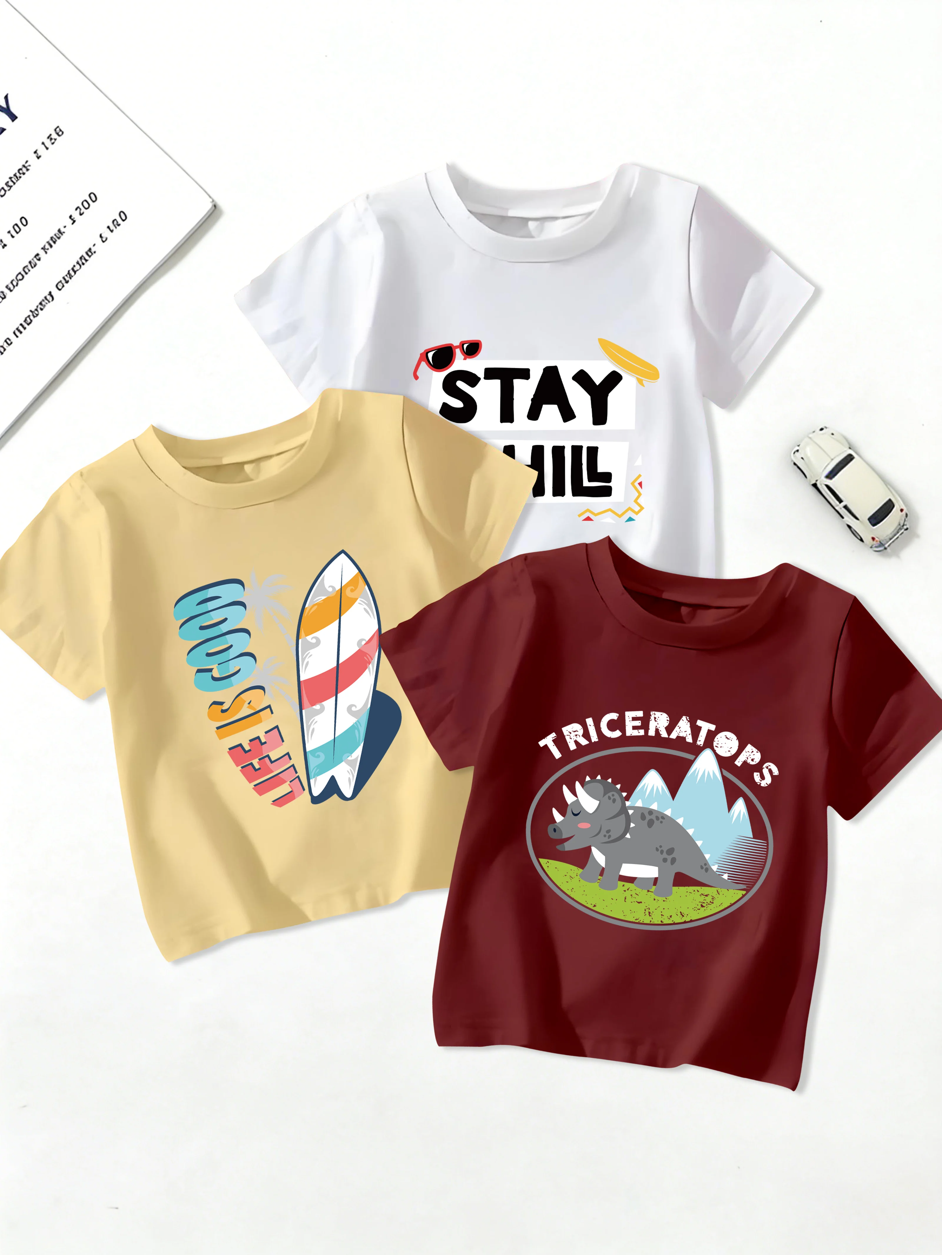 3 piezas: Camiseta informal con cuello redondo para niños, camiseta de verano con estampado de dibujos animados de Triceratops y monopatín y estampado gráfico en inglés
