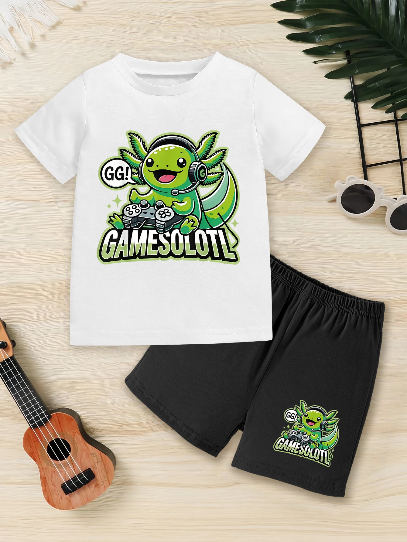 2 piezas: conjunto informal de verano para niños, camiseta con estampado de dibujos animados de axolotl verde jugando, pantalones cortos