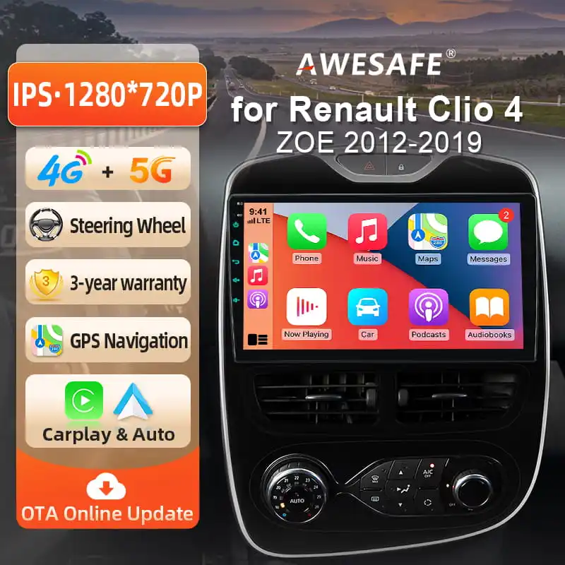 Radio AWESAFE con CarPlay y Android Auto inalámbrico para Renault Clio 4 2012-2019, GPS, Navegación, Plug and Play, RDS, DSP, CAN-BUS, Retención de Datos, 4G, Bluetooth