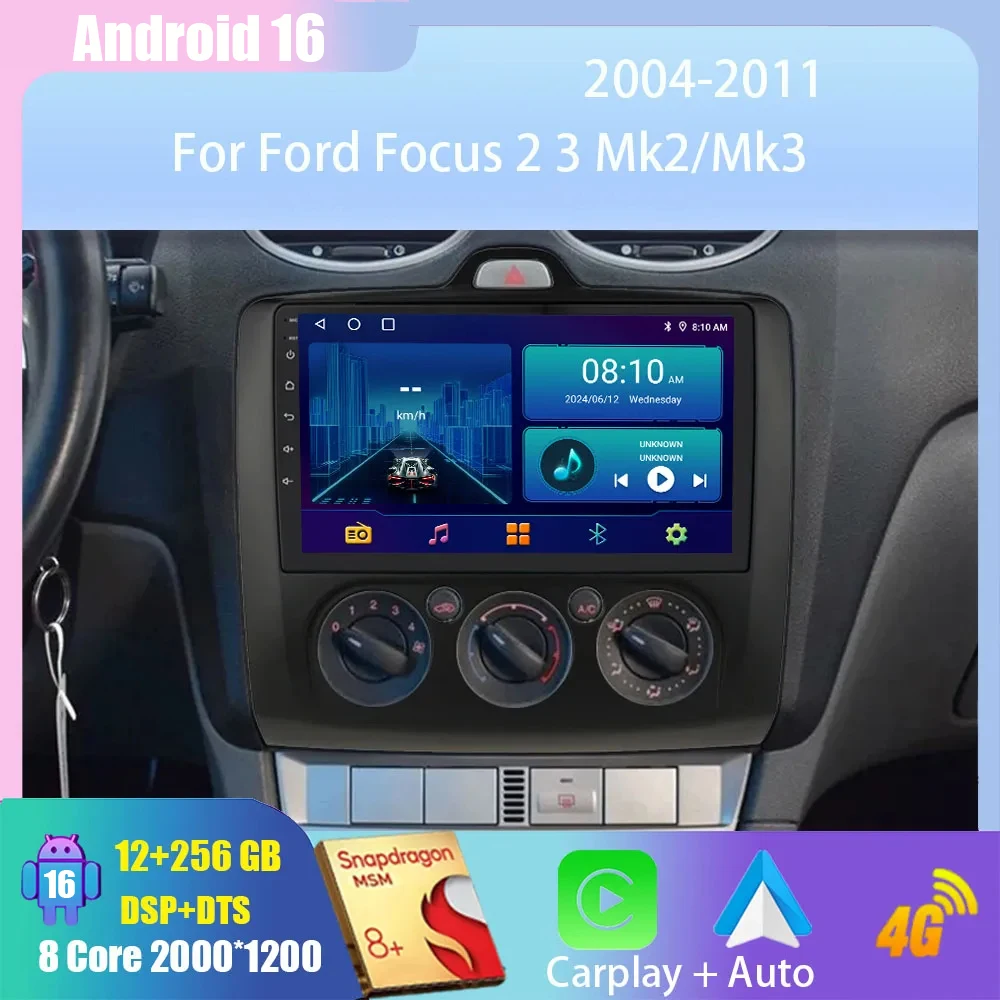 Radio para Auto Android 16 para Ford Focus 2 3 Mk2/Mk3 2004-2011, Carplay, Reproductor Multimedia 2 Din, GPS, 4G, Estéreo, RDS, Unidad Principal