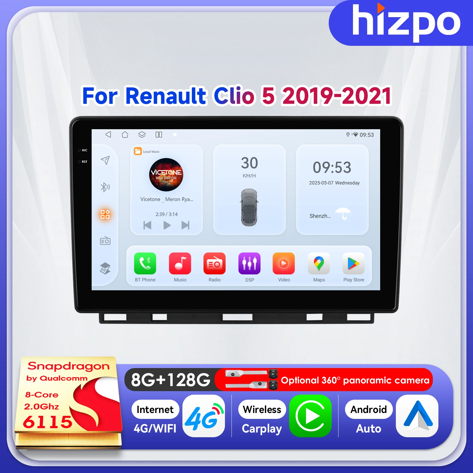 Hizpo - Reproductor Multimedia con Pantalla Táctil de 9 Pulgadas, Android 14, Control por Voz con IA, para Renault Clio 5 2019-2021, Carplay, Navegación, Pantalla QLED, WIFI, ADAS