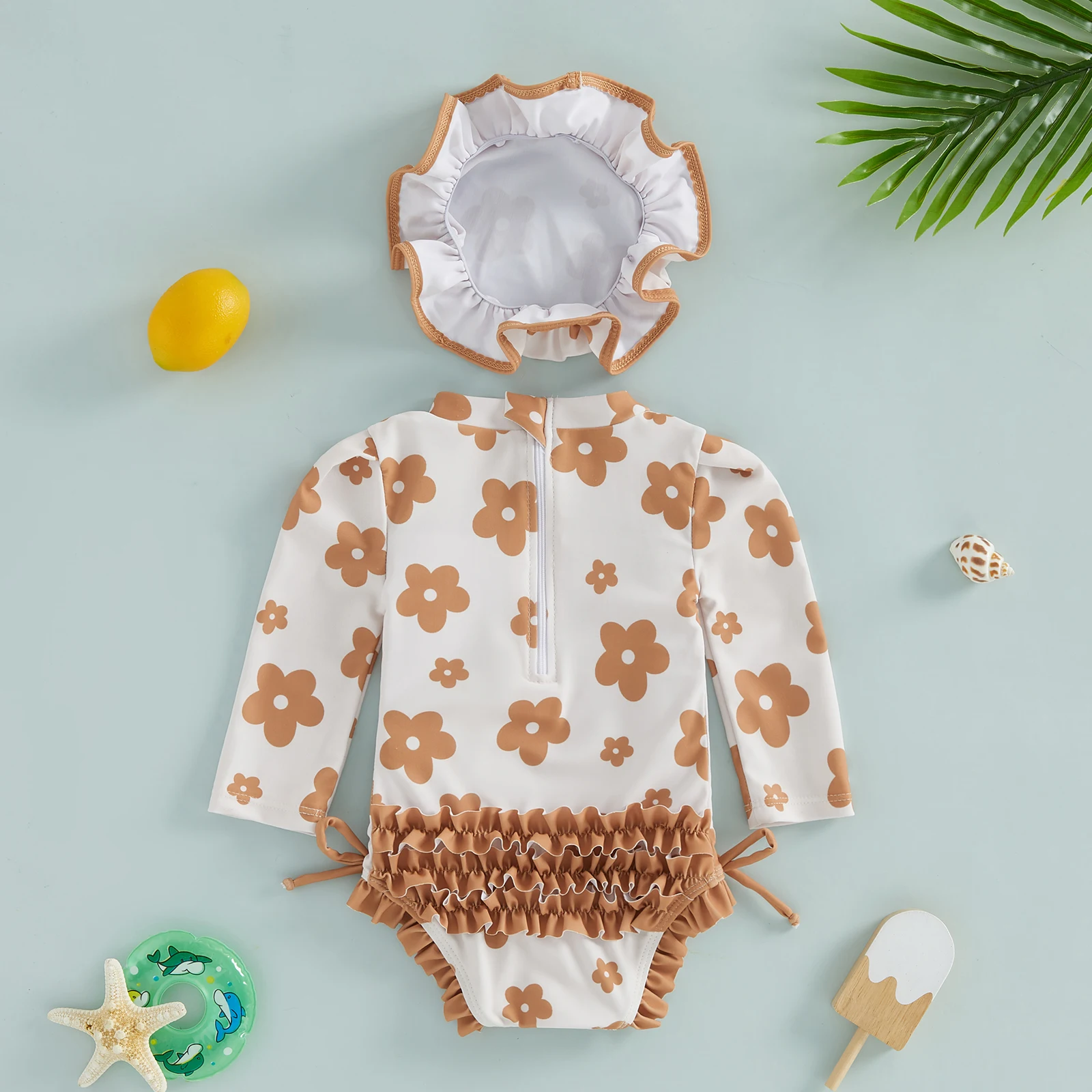 Trajes de baño de verano para niñas pequeñas, trajes de baño de manga larga con estampado de flores/lazos, trajes de baño con volantes y sombreros