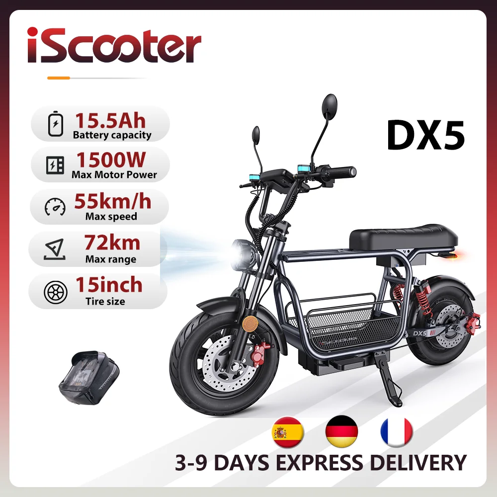 Scooter eléctrico iScooter DX5 de 1500W, batería de 48V, 15,6Ah, velocidad máxima de 55 km/h, alcance de 60-72km con asiento y cesta, neumáticos de 15 "con NFC