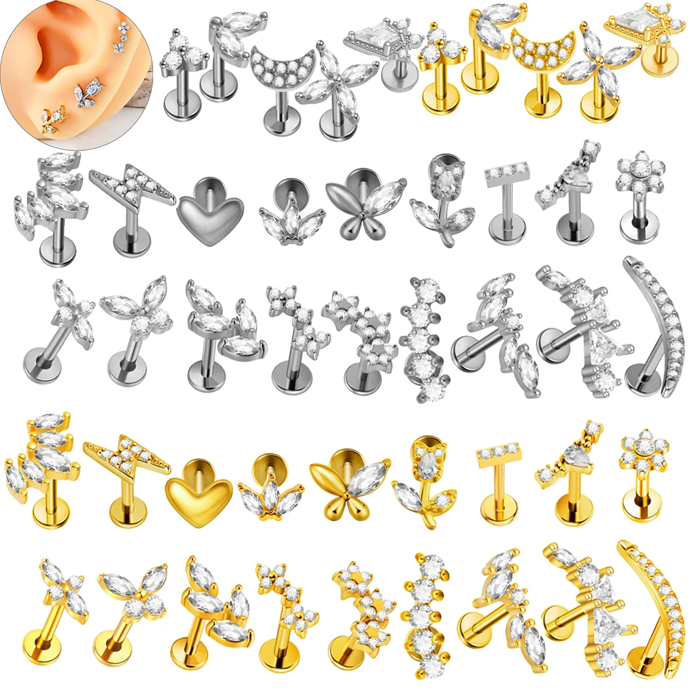 1 pieza tres/cinco Squa/corazón/trapézoidal CZ arco larbet LipStud acero quirúrgico hilo interno cartílago hélice Tragus pendiente Piercing
