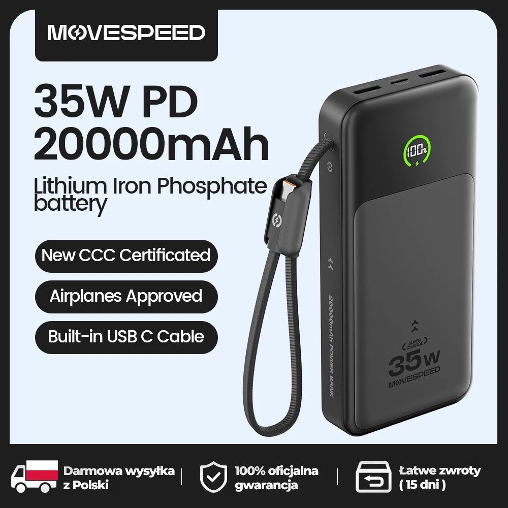 【CCC】MOVESPEED P20 Power Bank 20000mAh 35W PD Cargador externo con batería LFP de carga rápida para iPhone Xiaomi Samsung