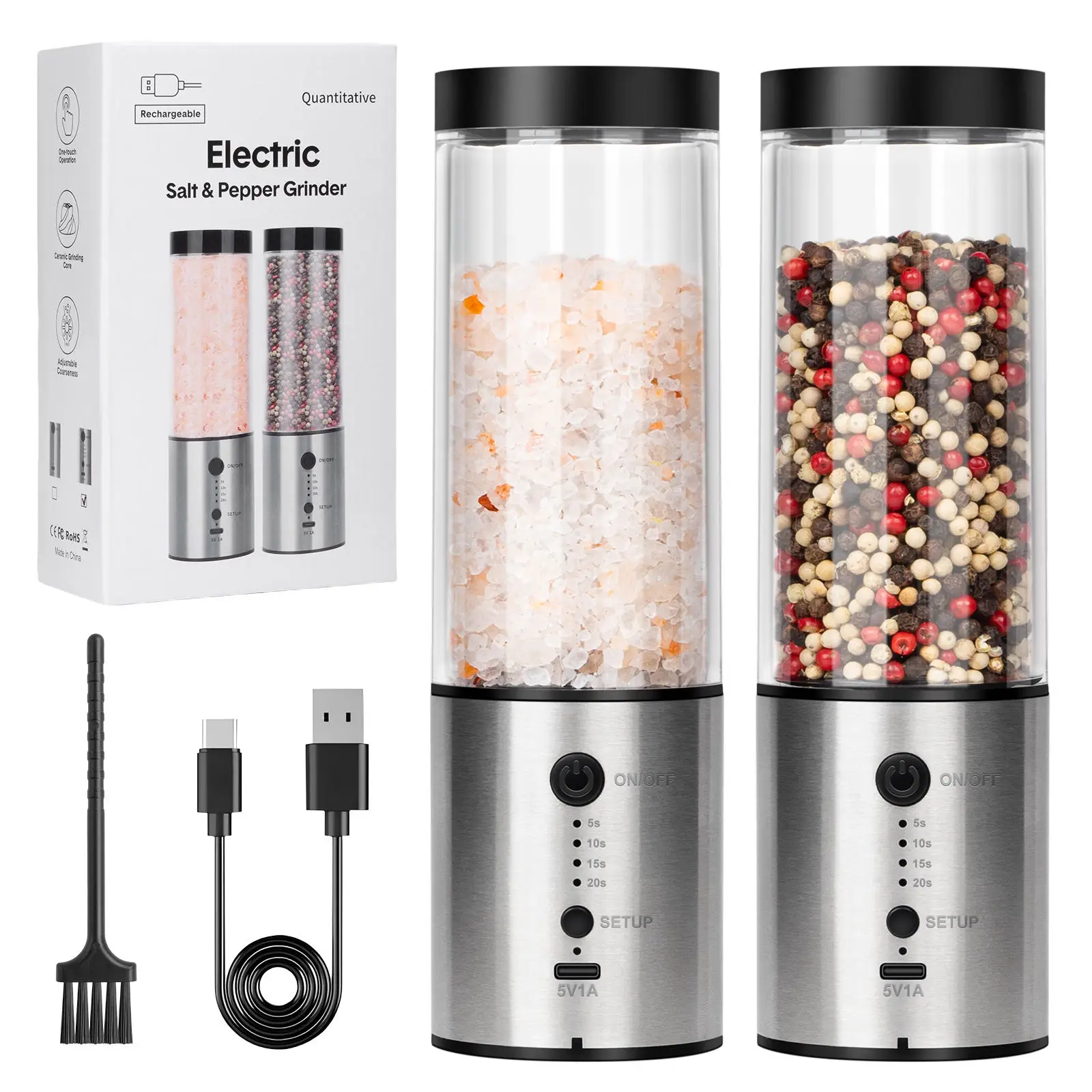 Molinillo de pimienta eléctrico, molinillo de pimienta recargable de acero inoxidable con contenedor de aspereza ajustable externo a