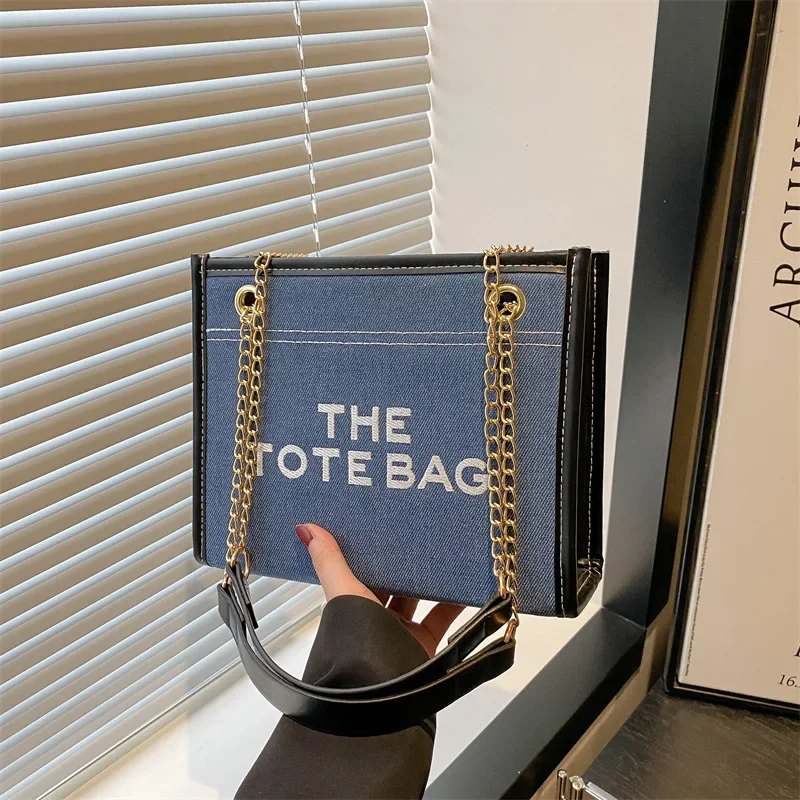 Bolso de Mano de Mezclilla con Parches para Mujer, Bolso Bandolera con Cadena y Letras Bordadas de Gran Capacidad