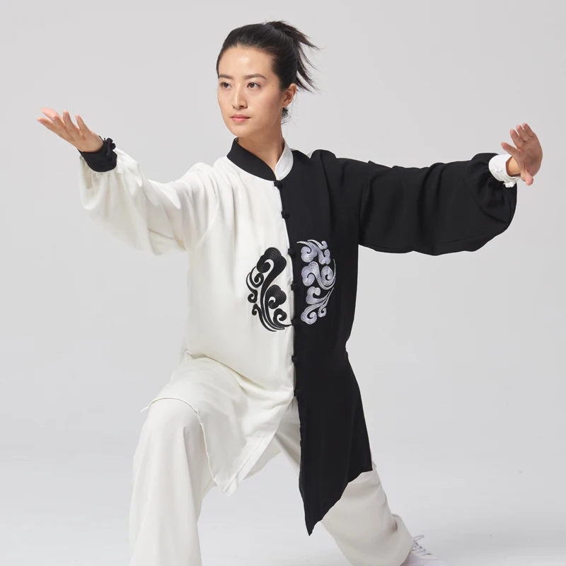 Uniforme de Tai Chi personalizable para hombres y mujeres, traje de entrenamiento de lino Tencel bordado en blanco y negro, actuación de competición, artes marciales
