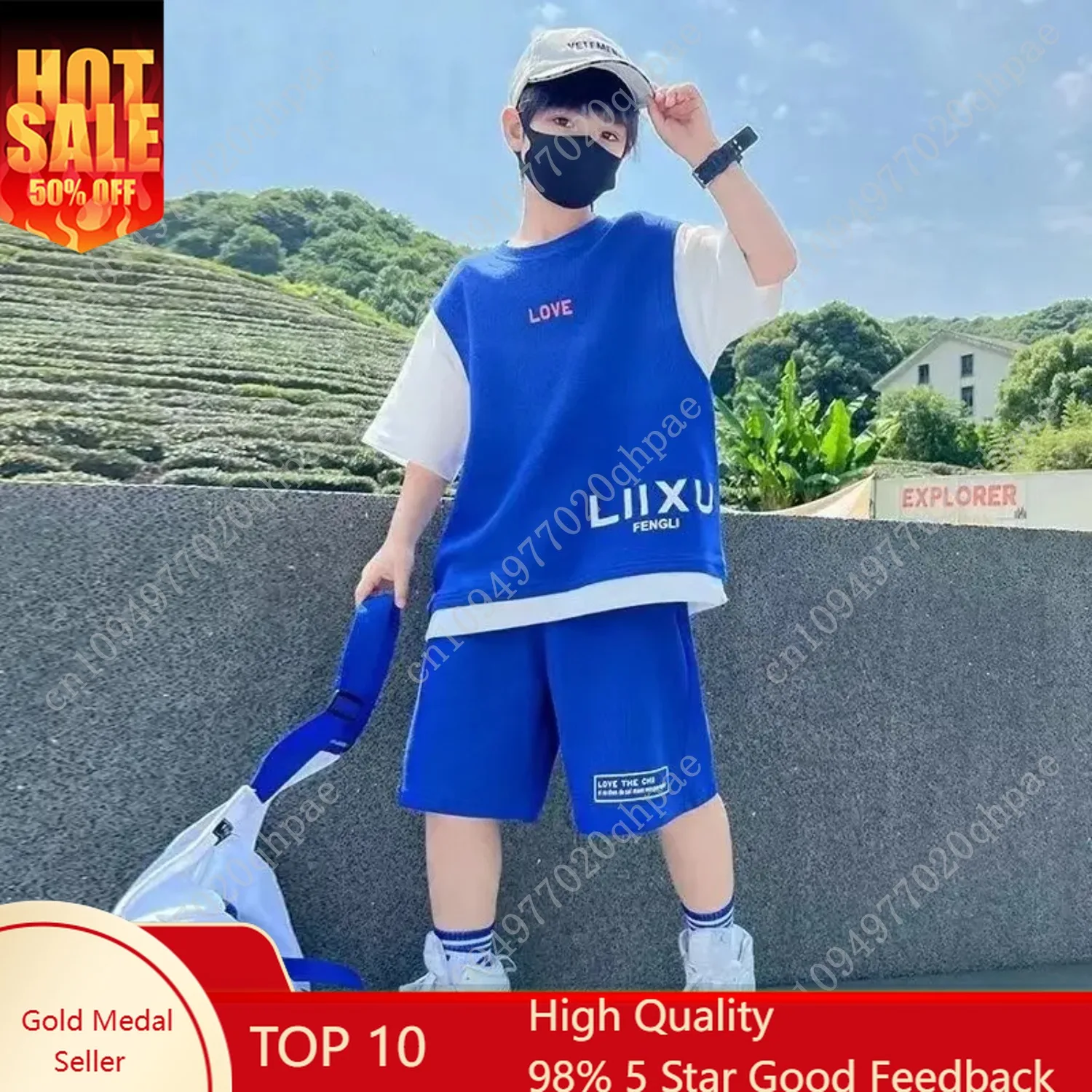 Traje de verano para niños jóvenes, pantalones cortos de manga corta con retazos a la moda para niños, traje deportivo, ropa de tendencia de 3 a 14 años