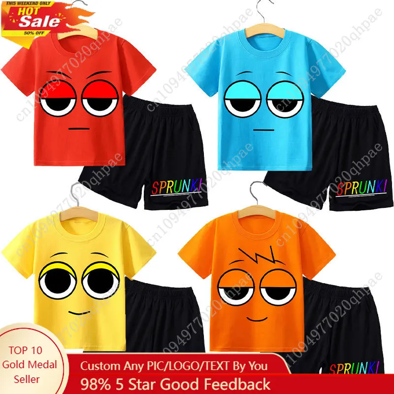 Conjunto de camiseta y pantalones cortos Sprunki para niños, moda de dibujos animados de Anime, camisa de manga corta, pantalones, traje para niños y niñas, trajes Kawaii de verano, 2 uds.
