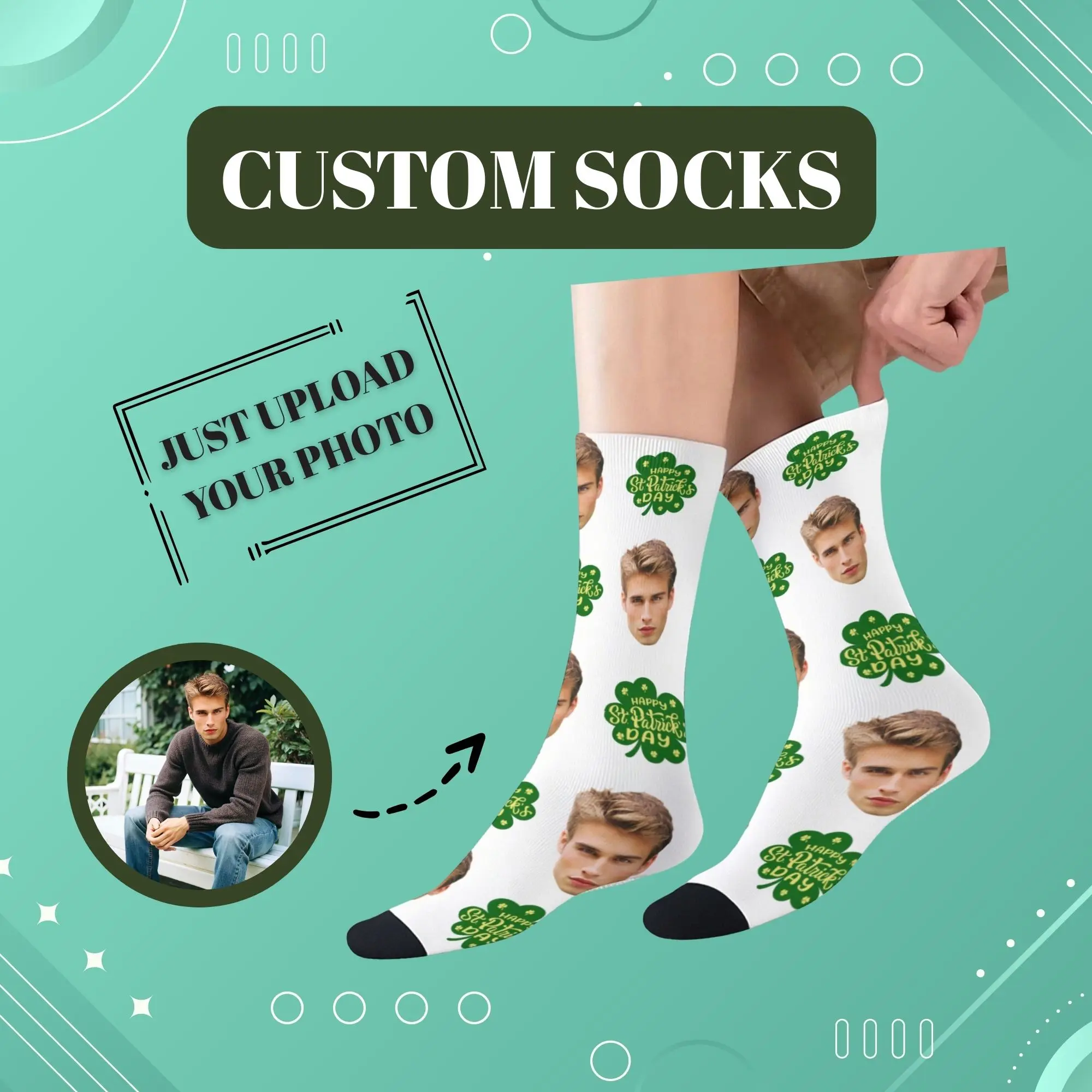 Calcetines Personalizados con Foto, Diseño de Trébol, Calcetines con Impresión Personalizada, Regalo Ideal para el Día de San Patricio