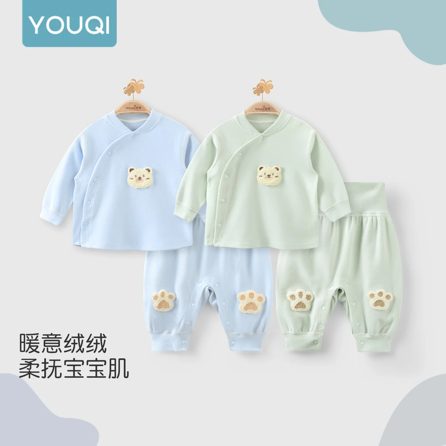 【Youqi】Ropa de bebé china para niños de 0 a 2 años, conjunto dividido de oso térmico para niños con cuello levantado y entrepierna abierta de cintura alta para otoño e invierno