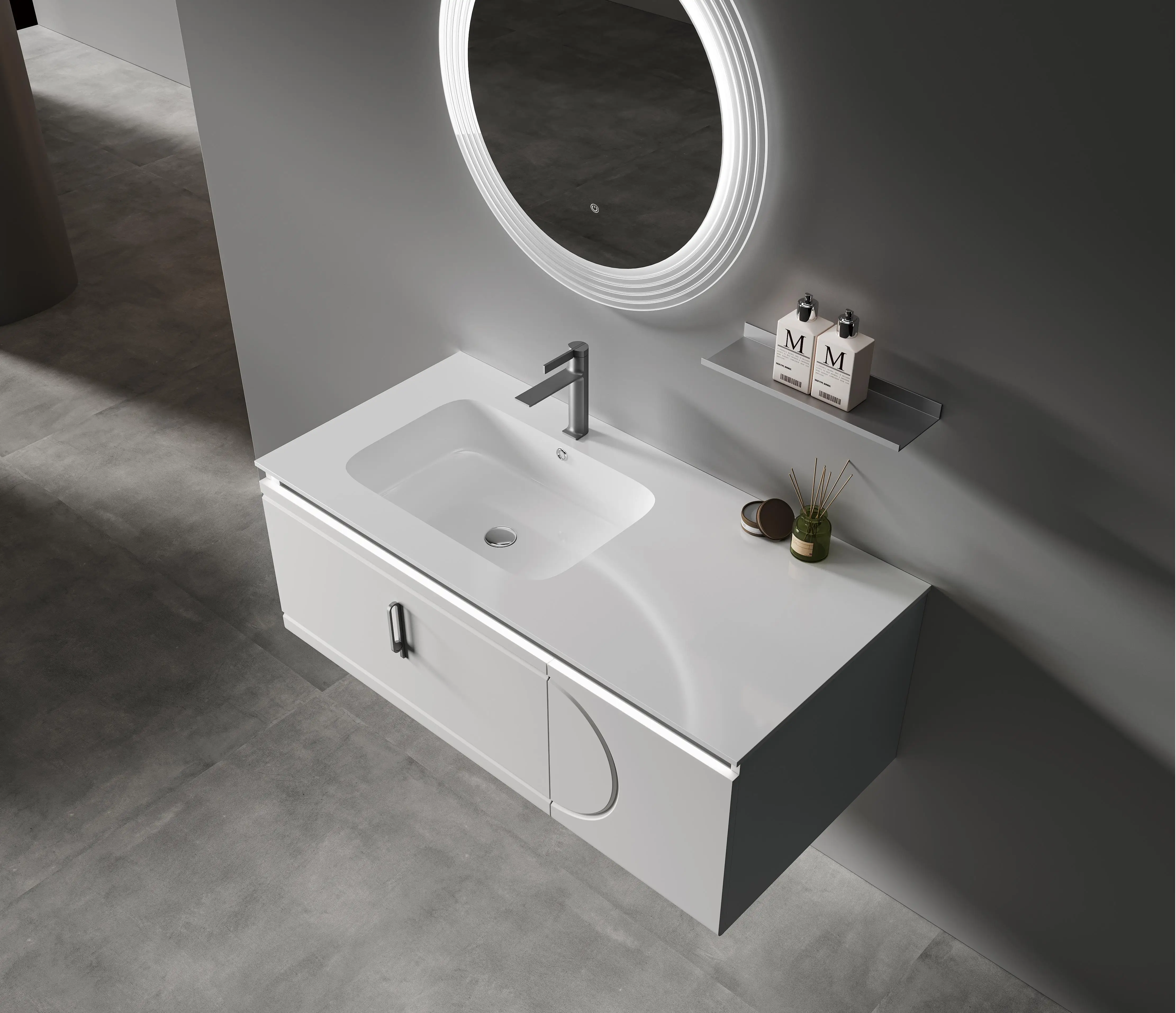 Más popular, diseño moderno, tocador de baño de madera maciza, espejo LED, lavabo de cerámica de pizarra, carcasa lacada, Sensor de luz para hoteles