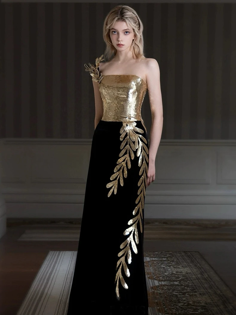 Vestido de Noche Largo Negro Dorado de Sirena con Lentejuelas, Sin Mangas, Sin Tirantes, para Mujer, Boda, Fiesta de Celebridades