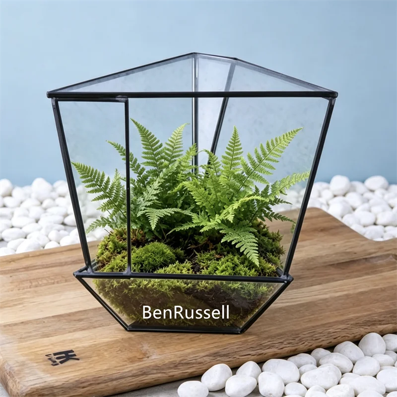 Mini Terrario de Vidrio Geométrico en Forma de Triángulo con Musgo y Helecho, Micro Paisaje, Florero de Vidrio, Contenedor, Invernadero de Mesa