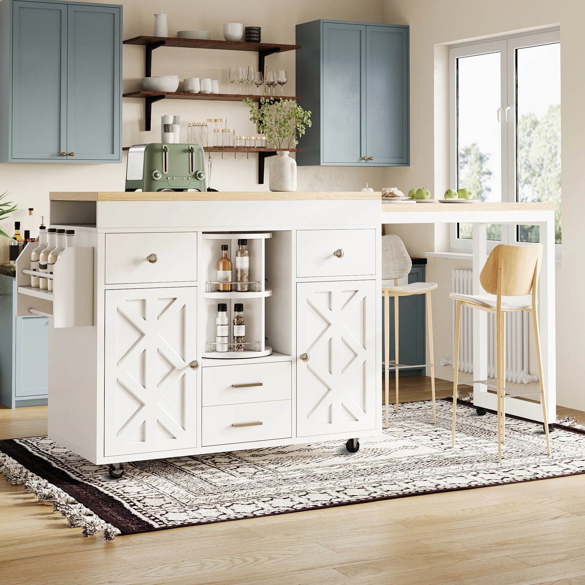 Mesa de bar extensible moderna, carrito de cocina/carrito de servicio con tablero extensible, 360 ° Organizador giratorio, estantes ajustables