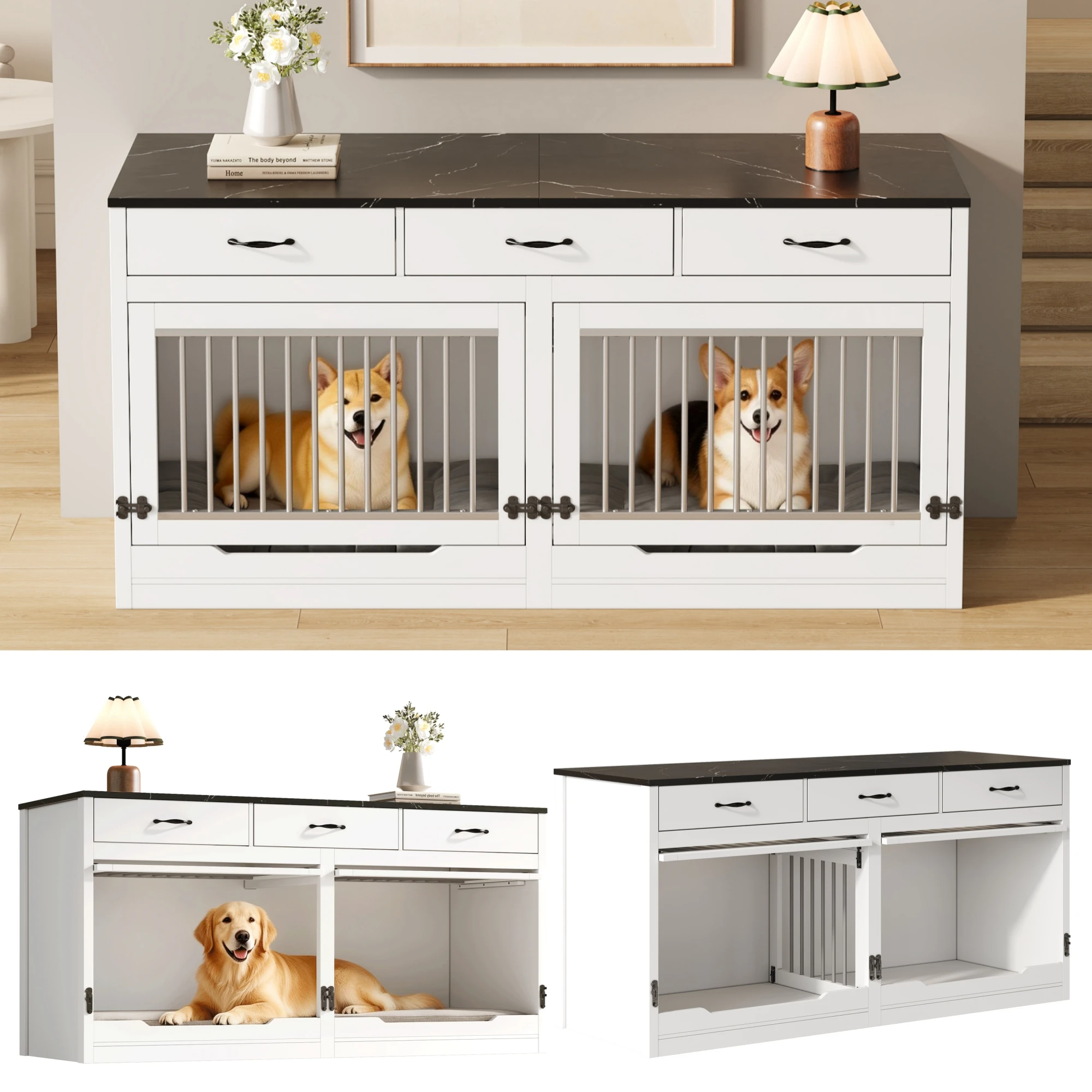 Caja de Madera y Metal para 2 Perros, Caseta para Perros de Interior, Cierre con Llave, Puerta Plegable, Divisor Extraíble, 3 Cajones