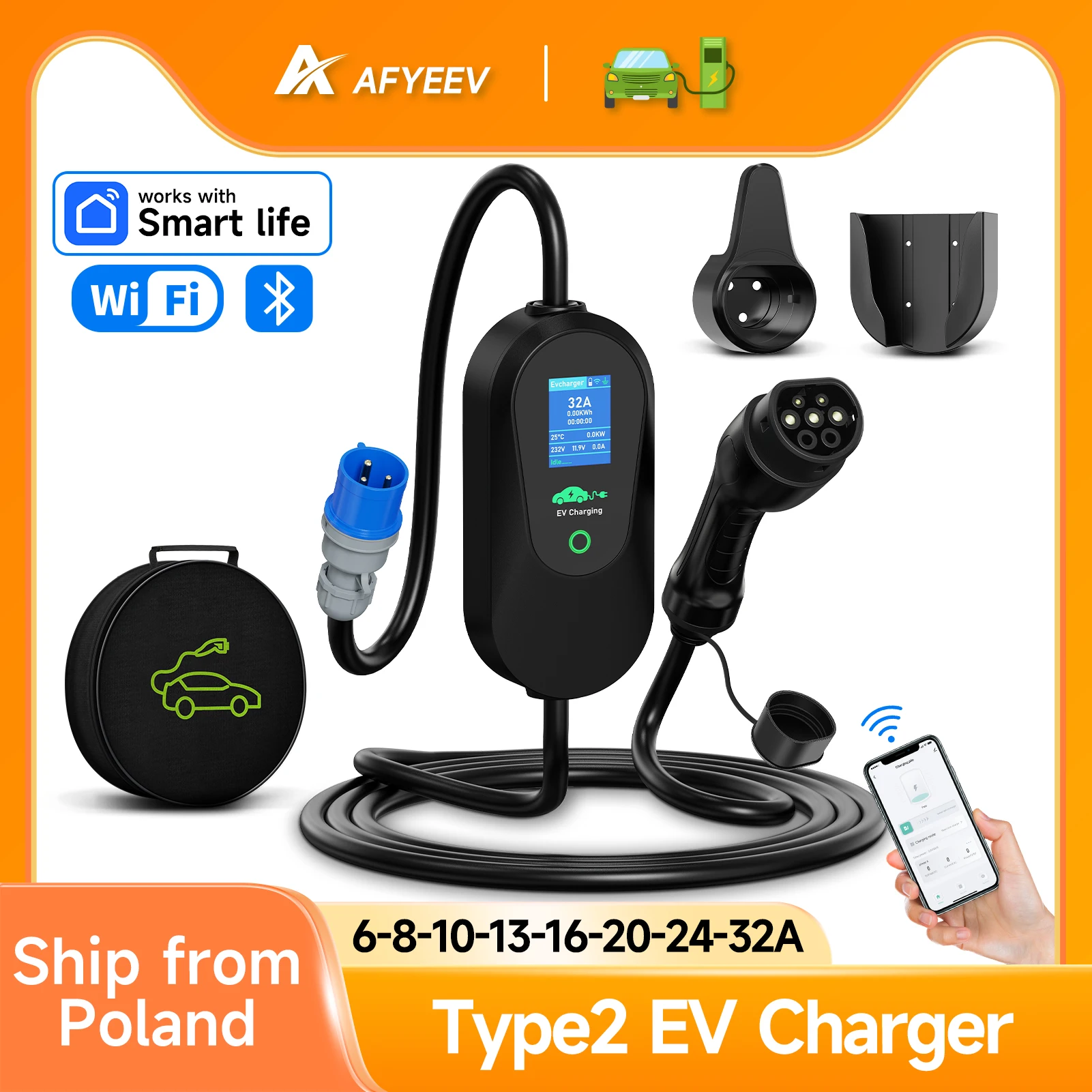 AFEEV Type2 IEC 62196-2 cargador EV portátil 7.2KW 32A 1 fase Wallbox EVSE Cable de carga rápida WiFi aplicación Bluetooth Control remoto