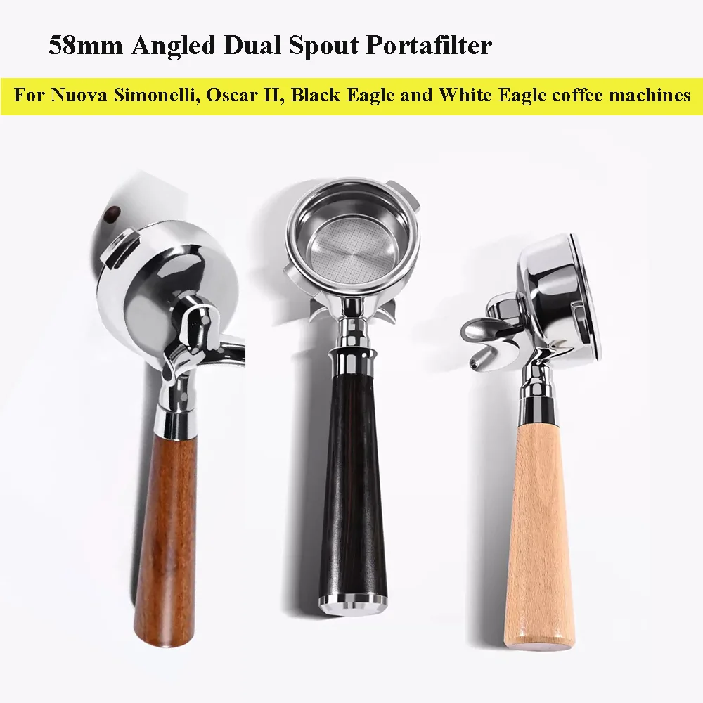 Portafiltro de doble boquilla en ángulo de 58 mm para máquinas de espresso Nuova Simonelli/Oscar II/Black Eagle/White Eagle con cesta para 2 tazas