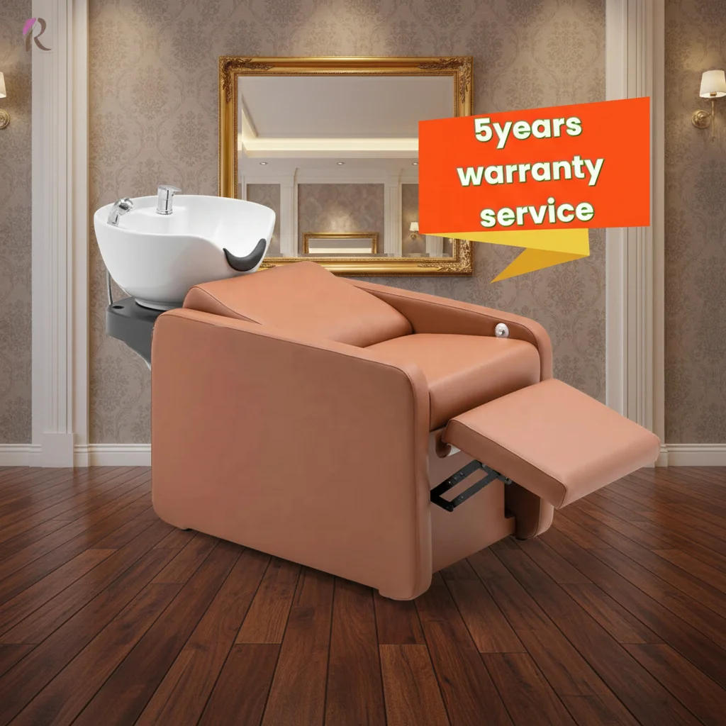 Sillón de Peluquería de Diseño Moderno con Lavabo de Cerámica Ajustable, Patas de Hierro Plateadas, Fácil de Limpiar, Cubierta de PU