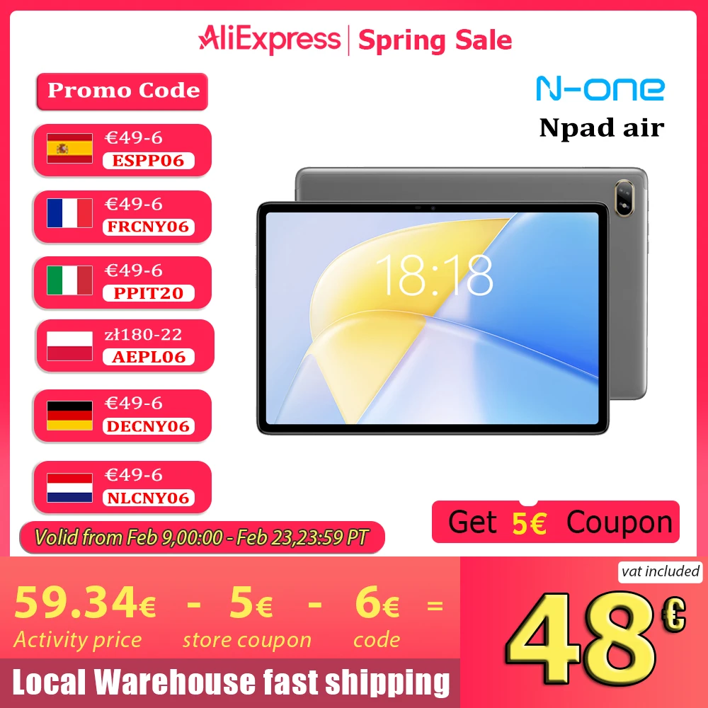 Tablet PC N-ONE NPad Air, 4 GB de RAM + 4 GB de Expansión, 64 GB de ROM, 10.1 Pulgadas, 1280*800 FHD IPS, UNISOC T310, Red 4G, Android 12, Tipo-C, Doble WIFI, BT5.0