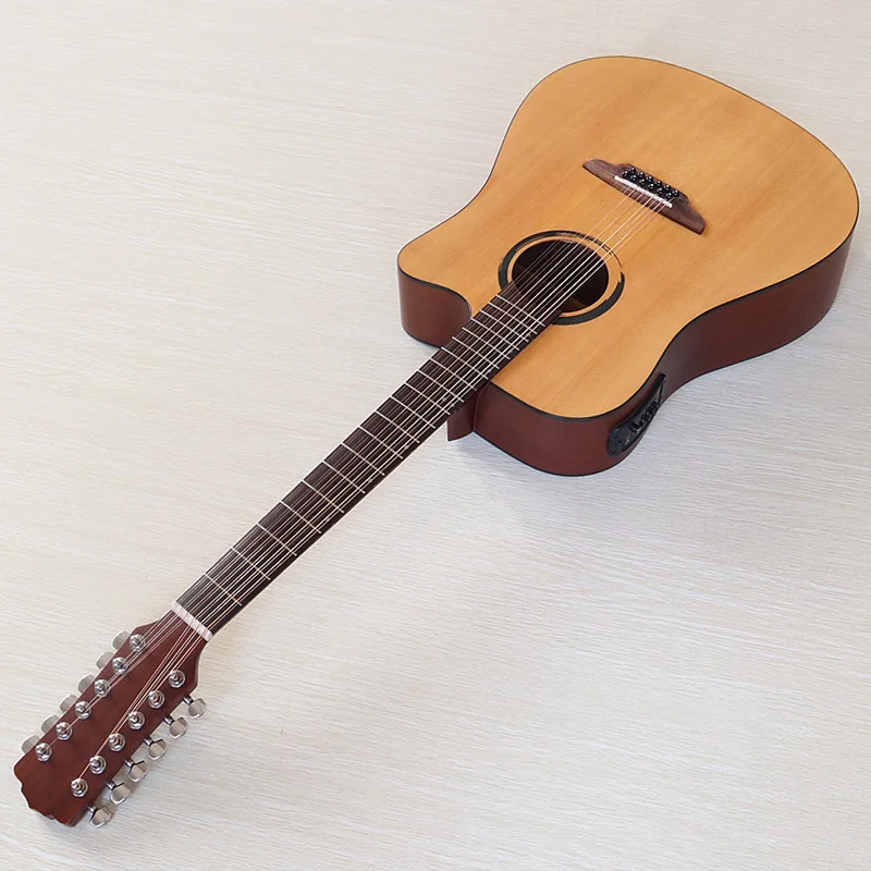 Guitarra Electroacústica de 12 Cuerdas, Tapa de Abeto Sólido, Cuerpo de Sapele, 41 Pulgadas, Acabado Mate, Cutaway, Guitarra Folk con EQ, Color Natural y Marrón